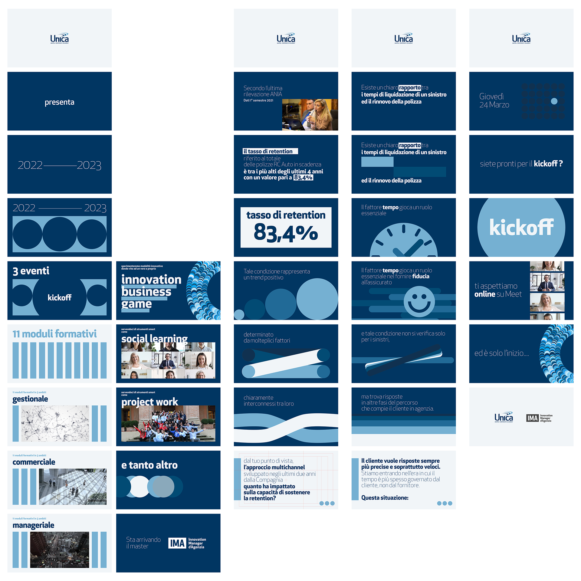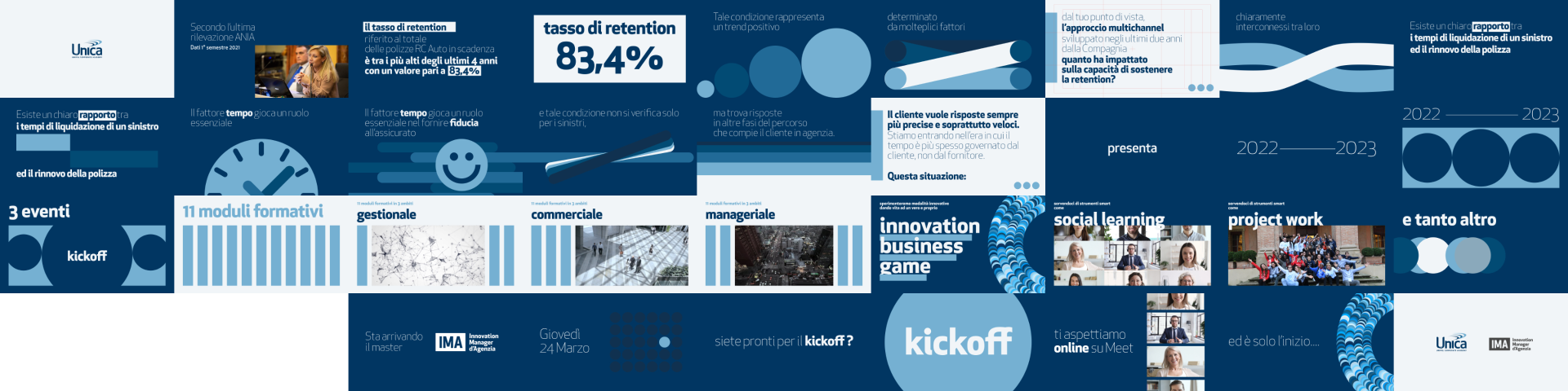 Set of videos made to present master IMA led by Unipol Unica academy. The visual language is flat, modular and geometric. Based on the combination of typography, a color palette in shades of blue.